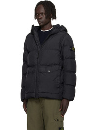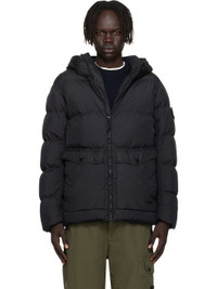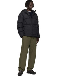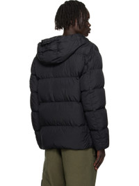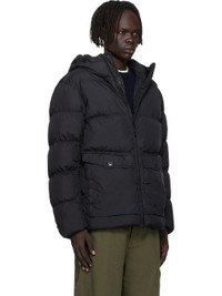 Down-filled and coated crinkled nylon taffeta jacket. · RDS-certified down · Water-resistant, wind-resistant garment-dyed · Bungee-style drawstring at hood and hem · Two-way zip and press-stud closure · Flap and welt pockets at waist · Detachable felted logo patch at sleeve · Elasticized cuffs · Patch pocket at interior · Full plain-woven lining Supplier color: Black Fill 1: 80% duck down, 20% duck feather. Fill 2: 100% polyester. Body 1: 100% polyamide. Body 2: 100% polyurethane resin. Lining: 100% polyamide. Made in Indonesia 252828M178032