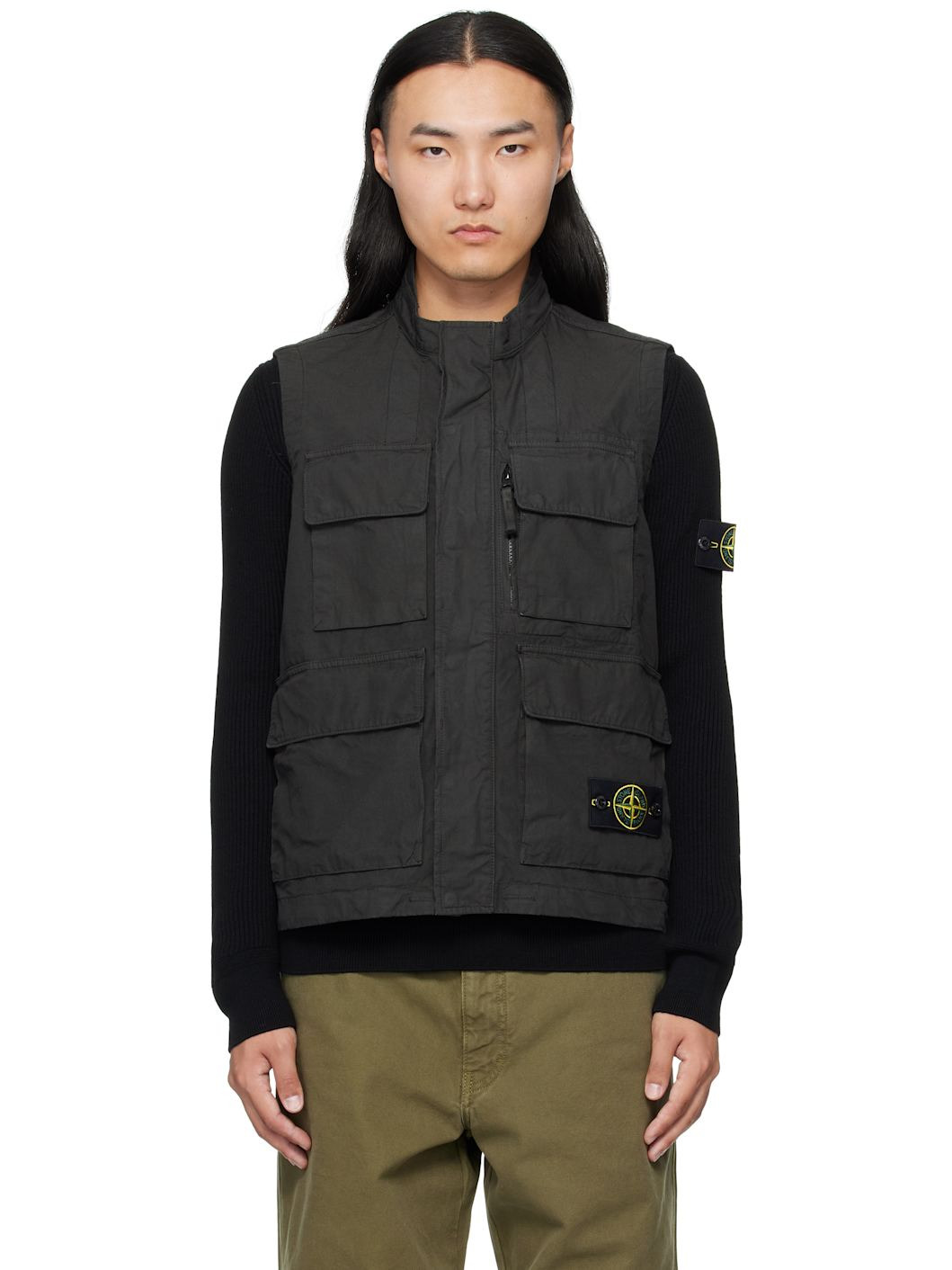 Garment-dyed organic cotton canvas vest. · Water-resistant anti-drop coating · Stand collar · Concealed zip closure with press-stud placket · Zip pocket and flap pockets at chest · Detachable logo patch and welt pockets at waist · Flap pocket at back waist · Unlined Supplier color: Desert 100% cotton. Made in Tunisia 252828M185001