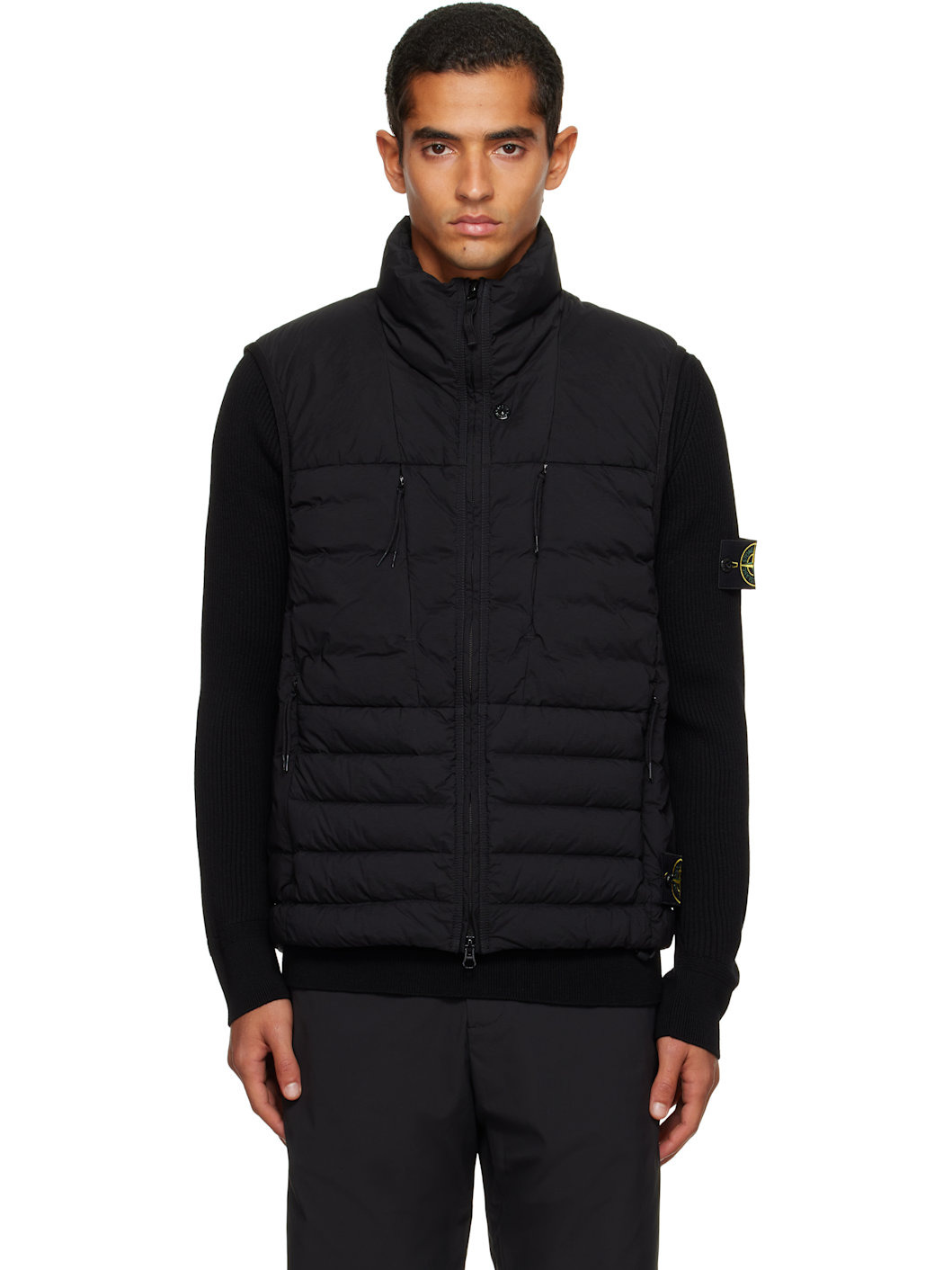 Down-filled and quilted stretch nylon taffeta vest. · RDS-certified down · Garment-dyed · Stand collar · Two-way zip closure · Zip pockets at chest and waist · Bungee-style drawstring at hem · Detachable felted logo patch at side seam · Elasticized armscyes · Fully lined Supplier color: Black Fill: 90% duck down, 10% duck feather. Body: 86% polyamide, 14% elastane. Lining: 86% polyamide, 14% elastane. Made in Viet Nam 252828M178010