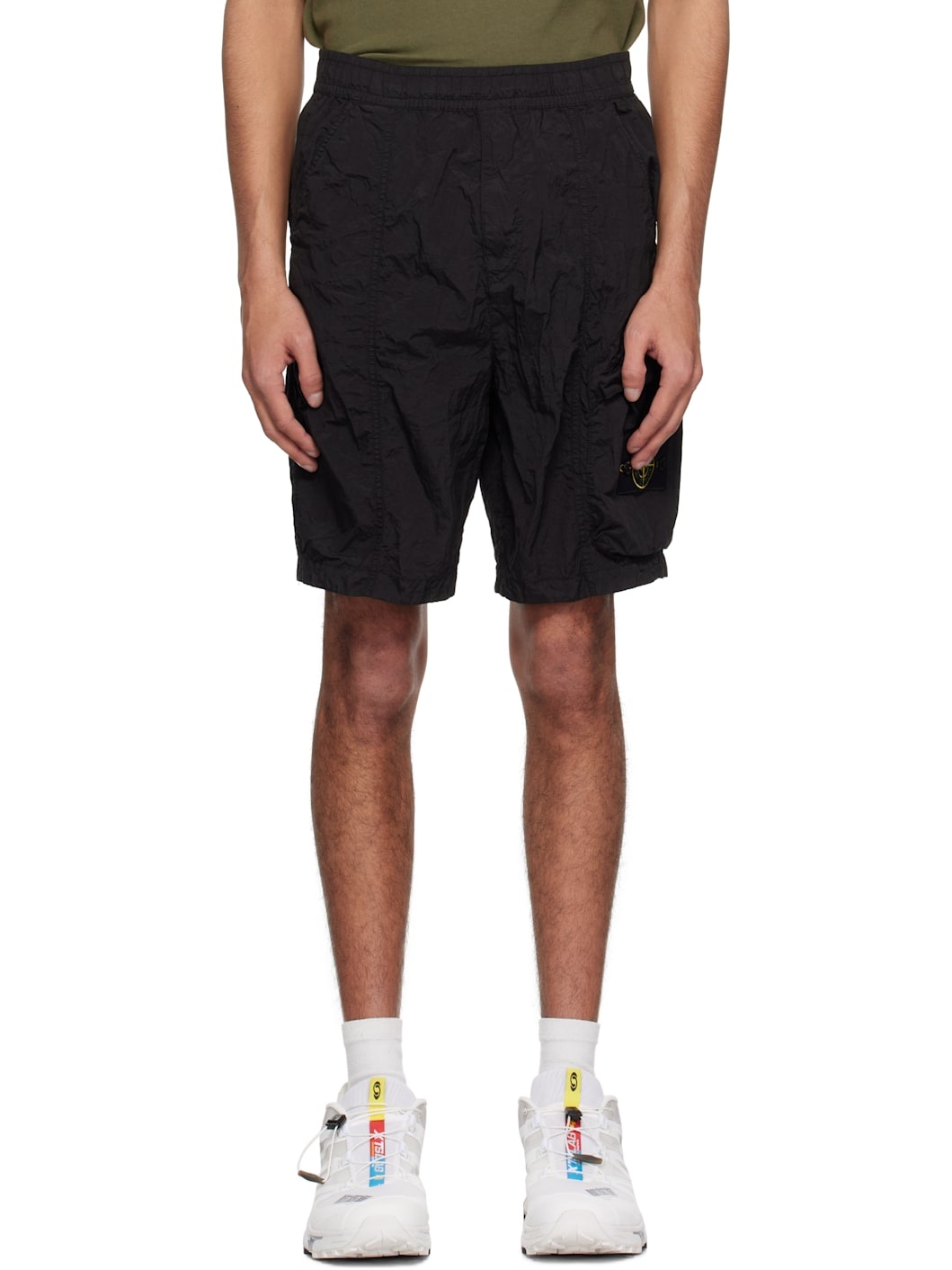 Crinkled ECONYL® recycled nylon taffeta shorts. · Concealed drawstring at elasticized waistband · Three-pocket styling · ZIp fly · Central seam at front legs · Detachable felted logo patch and zip pocket at outseam · Full mesh lining Supplier color: Black Supplier code: L100007 100% recycled polyamide. Made in Tunisia 251828M193015