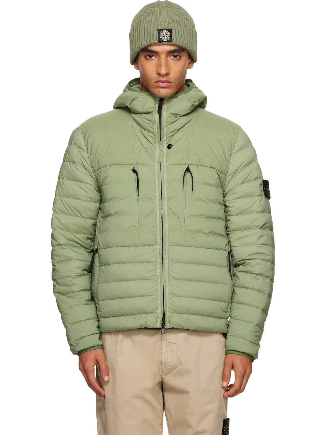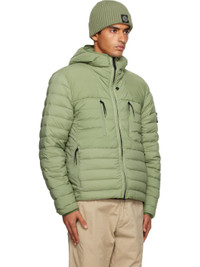 Down-filled and quilted stretch nylon taffeta jacket. · RDS-certified down · Garment-dyed · Elasticized trim at hood and cuffs · Two-way zip closure · Zip pockets at chest and waist · Bungee-style drawstring at hem · Detachable felted logo patch at sleeve · Fully lined Supplier color: Sage Fill: 90% duck down, 10% duck feather. Body: 86% polyamide, 14% elastane. Trim: 87% polyamide, 13% elastane. Lining: 86% polyamide, 14% elastane. Made in Viet Nam 252828M178022