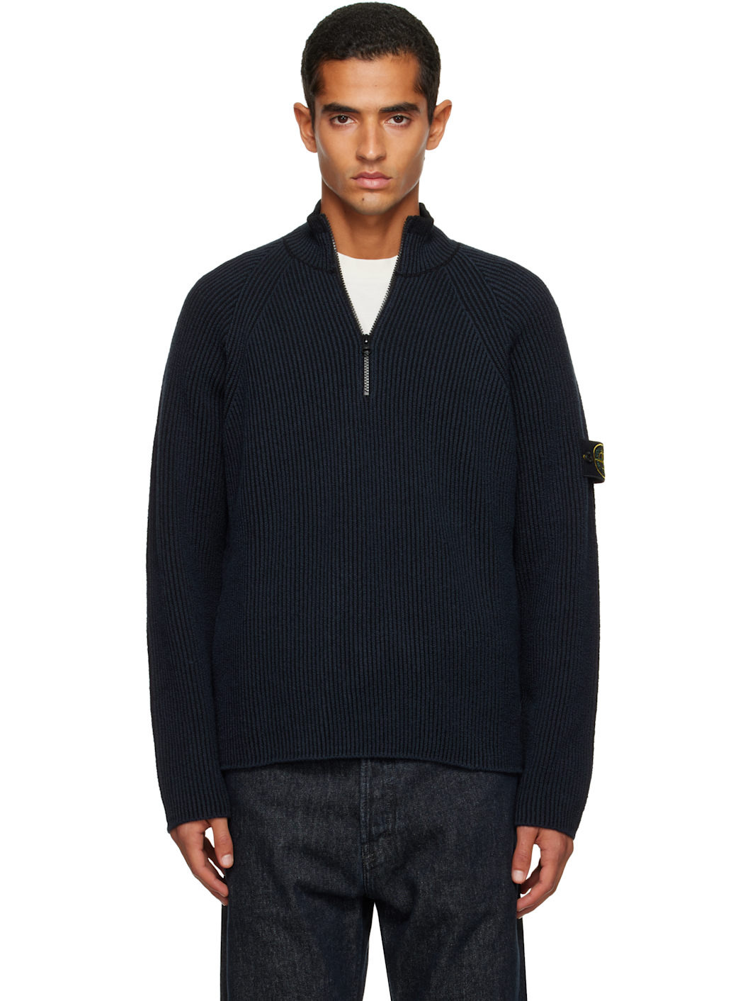 Rib-knit stretch virgin wool- and cotton-blend sweater. · Stand collar · Half-zip closure · Raglan sleeves · Detachable felted logo patch at sleeve Supplier color: Navy blue 57% virgin wool, 35% cotton, 7% polyamide, 1% elastane. Made in Croatia 252828M212002
