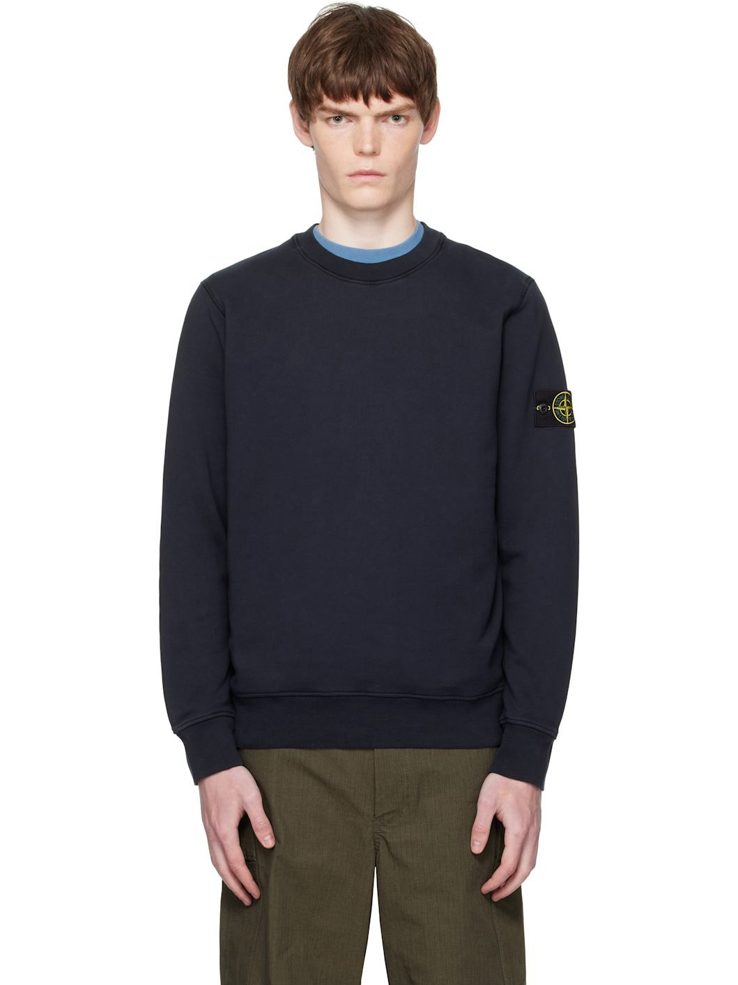 Garment-dyed organic cotton French terry sweatshirt. · Rib-knit crewneck, hem, and cuffs · Detachable felted logo patch at sleeve Supplier color: Navy blue Body: 100% organic cotton. Trim: 99% cotton, 1% elastane. Made in Moldova 252828M204007