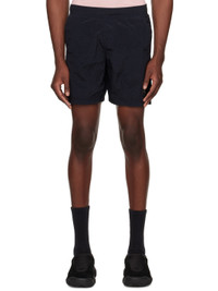 Crinkled ECONYL® regenerated nylon taffeta shorts. · Concealed drawstring at elasticized waistband · Three-pocket styling · Embroidered logo patch at front · Embroidered eyelets at back · Briefs-style mesh lining Supplier color: Navy blue Supplier code: 8015B0943 100% polyamide. Made in Indonesia 241828M193086