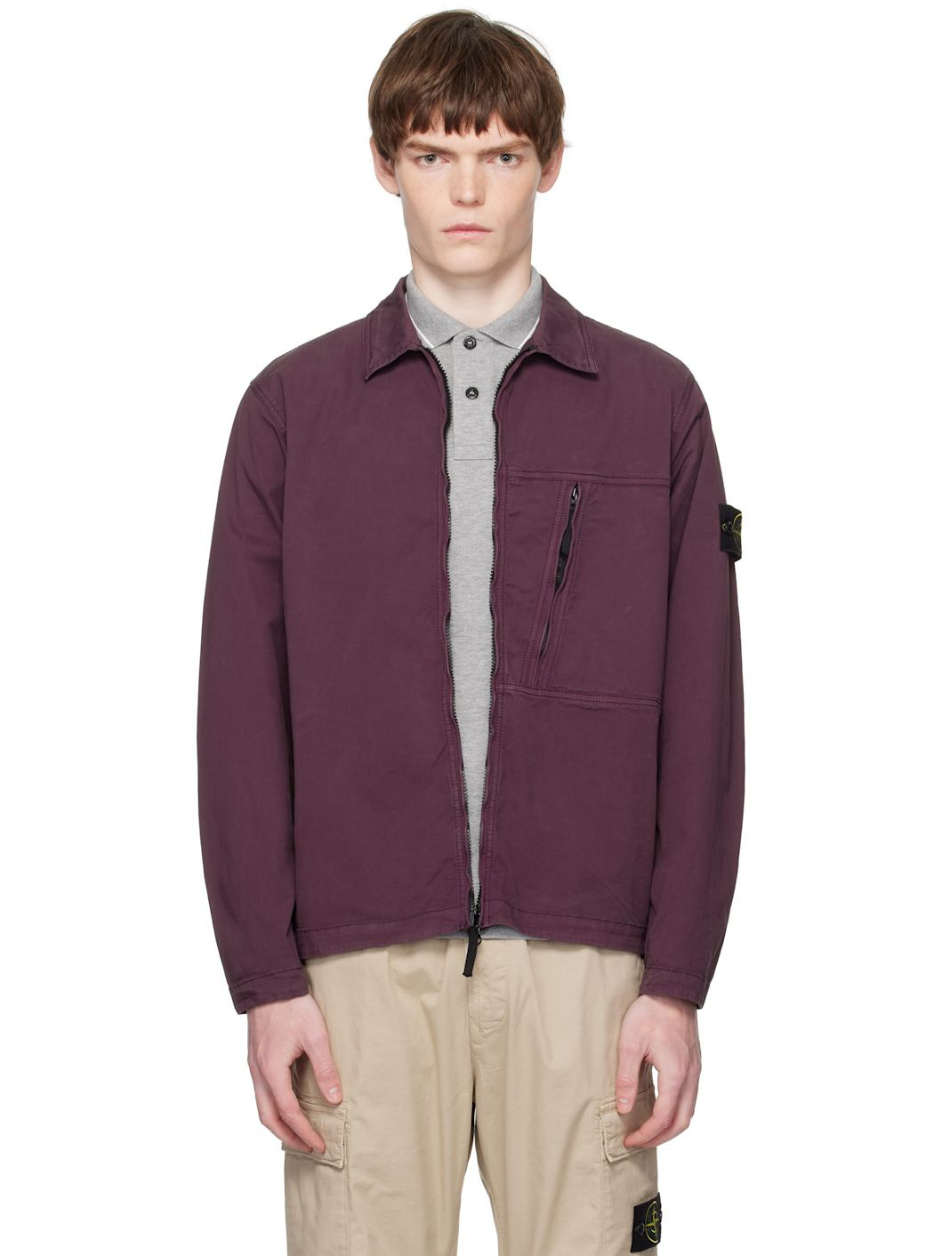 Stretch cotton twill jacket. · Fading throughout · Spread collar · Zip closure · Zip pocket at front · Detachable felted logo patch at sleeve · Press-stud fastening at cuffs Supplier color: Amaranth 97% cotton, 3% elastane. Made in Tunisia 252828M192026