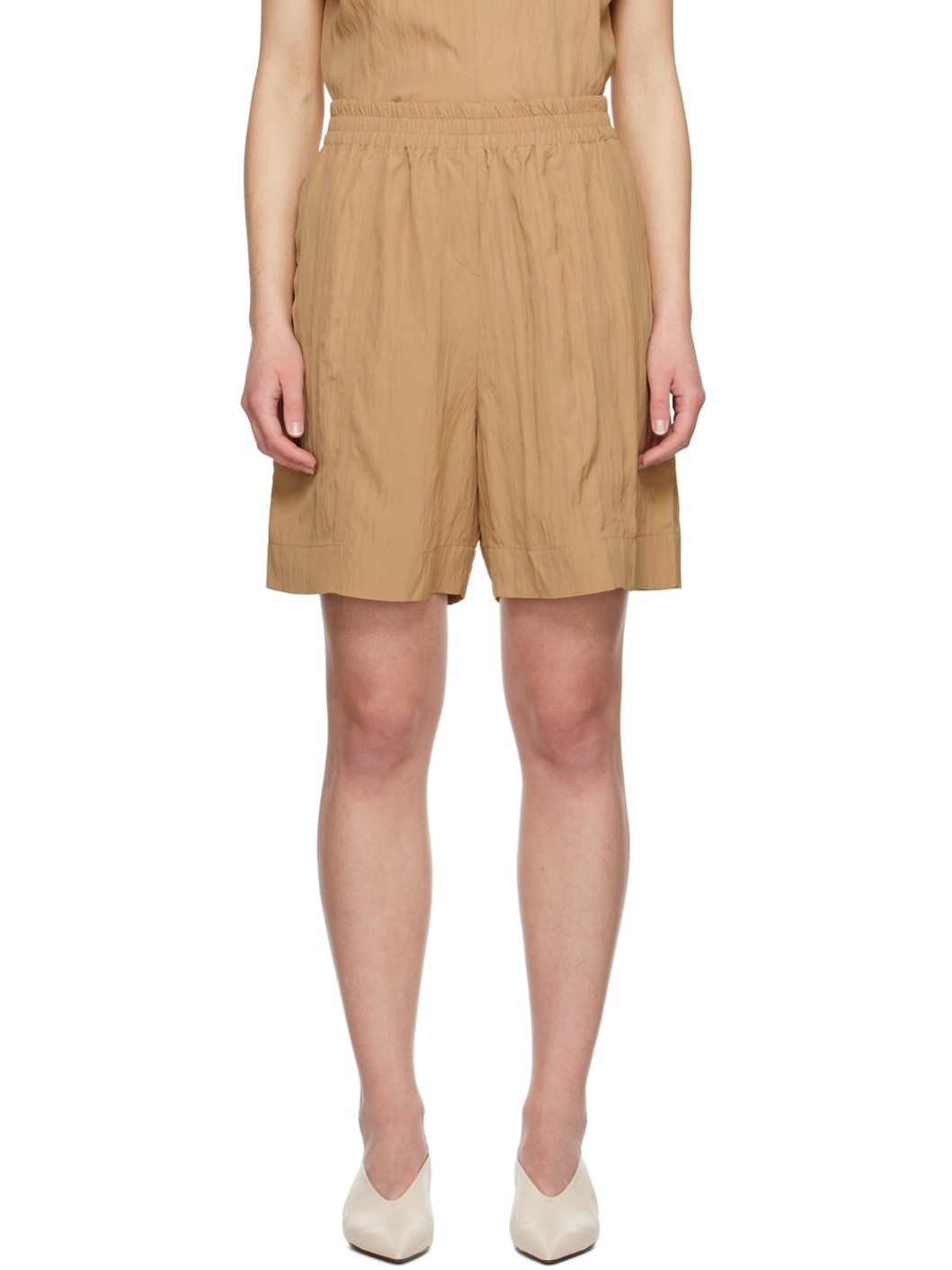 Crinkled viscose- and nylon-blend taffeta shorts. · Elasticized waistband · Two-pocket styling Supplier color: Sand 89% viscose, 11% polyamide. Made in Portugal 241608F088003