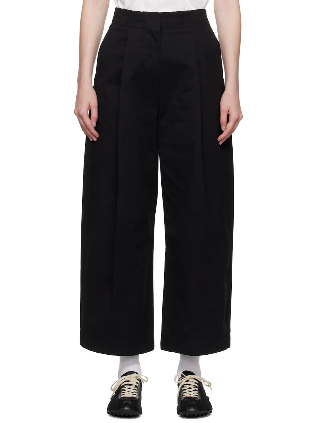 Peached cotton twill trousers. · Loose-fit · High-rise · Belt loops · Four-pocket styling · Zip fly · Pleats at front · Cropped leg · Dropped inseam Supplier color: Black 100% cotton. Made in Portugal 252608F087004