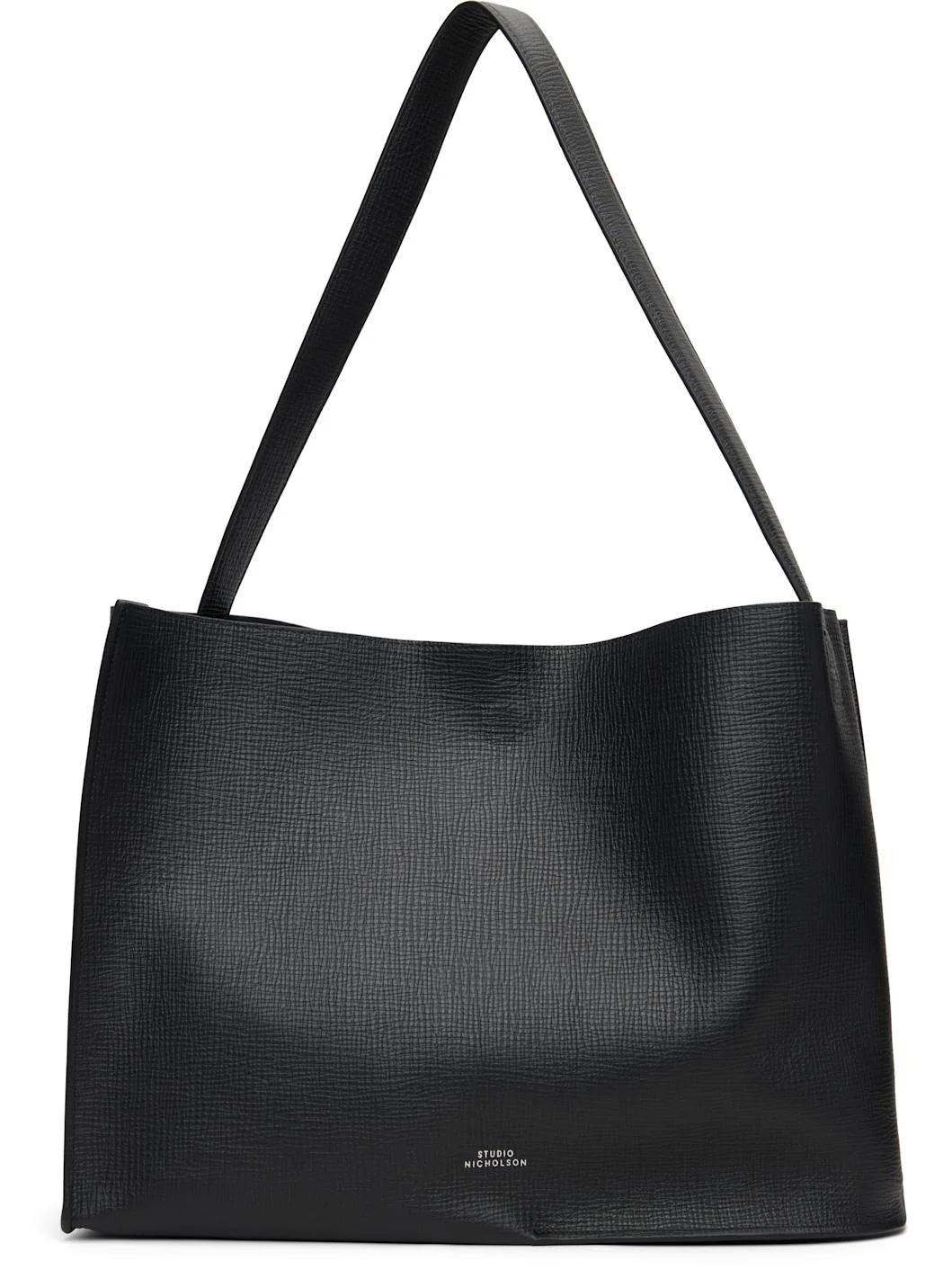 Grained calfskin tote. · Single-piece construction · Burnished edges throughout · Fixed shoulder strap · Detachable zip pouch at strap · Logo stamp at face · Magnetic closure · Microfibre lining · H12" x W17" x D6.75" Supplier color: Black Calfskin. Made in Italy 252608M172001