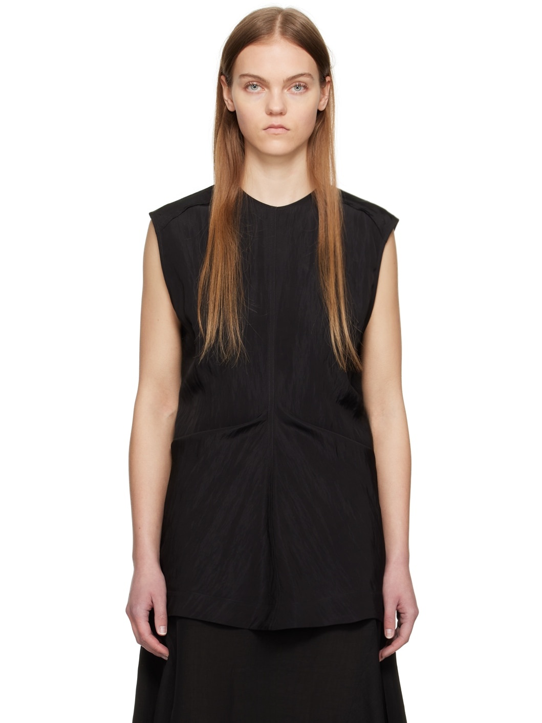 Crinkled viscose- and nylon-blend taffeta tank top. · Crewneck · Gathering at front · Saddle shoulders · Button closure at back Supplier color: Black 89% viscose, 11% polyamide. Made in Portugal 241608F107002