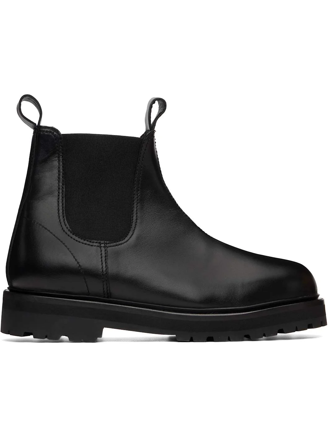 Ankle-high buffed calfskin Chelsea boots. · Pull-loops at collar · Elasticized gusset at sides · Suede and buffed leather lining · Treaded Vibram® rubber sole Supplier color: Black Upper: calfskin. Sole: rubber. Made in Portugal 252608M223000