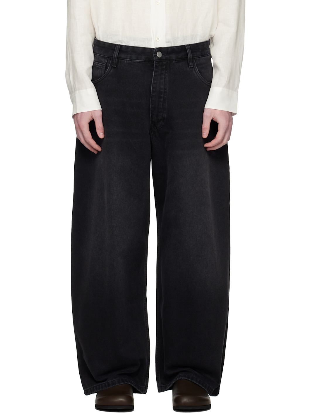 Non-stretch 14 oz regenerative cotton-blend denim jeans. · Subtle fading and whiskering throughout · Tapered and wide-leg · Belt loops · Five-pocket styling · Zip fly · Leather logo patch at back waistband Supplier color: Washed black 52% regenerative cotton, 48% cotton. Made in Turkey 252608M186004