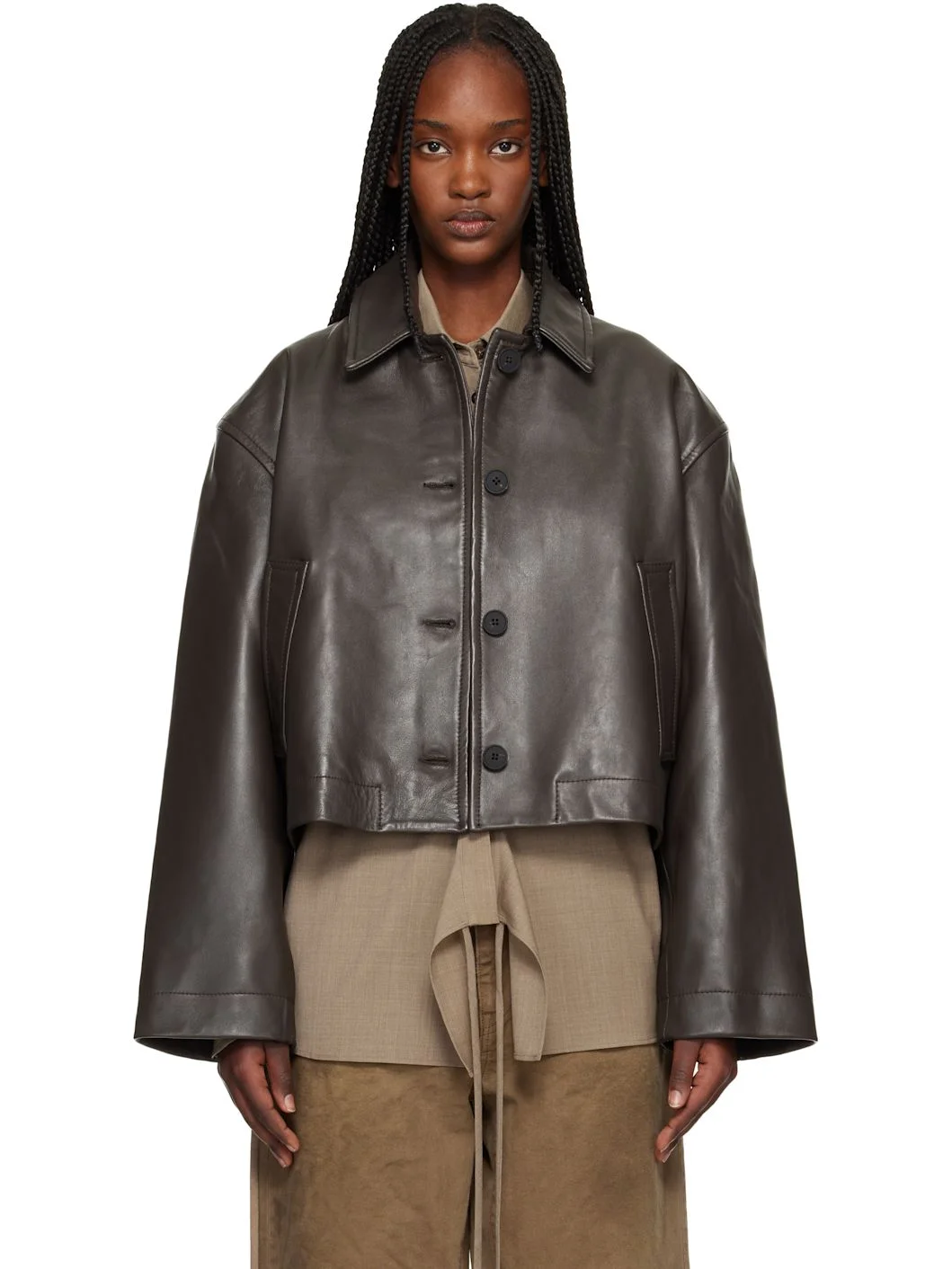 Brown Button Through Cropped Leather Jacket