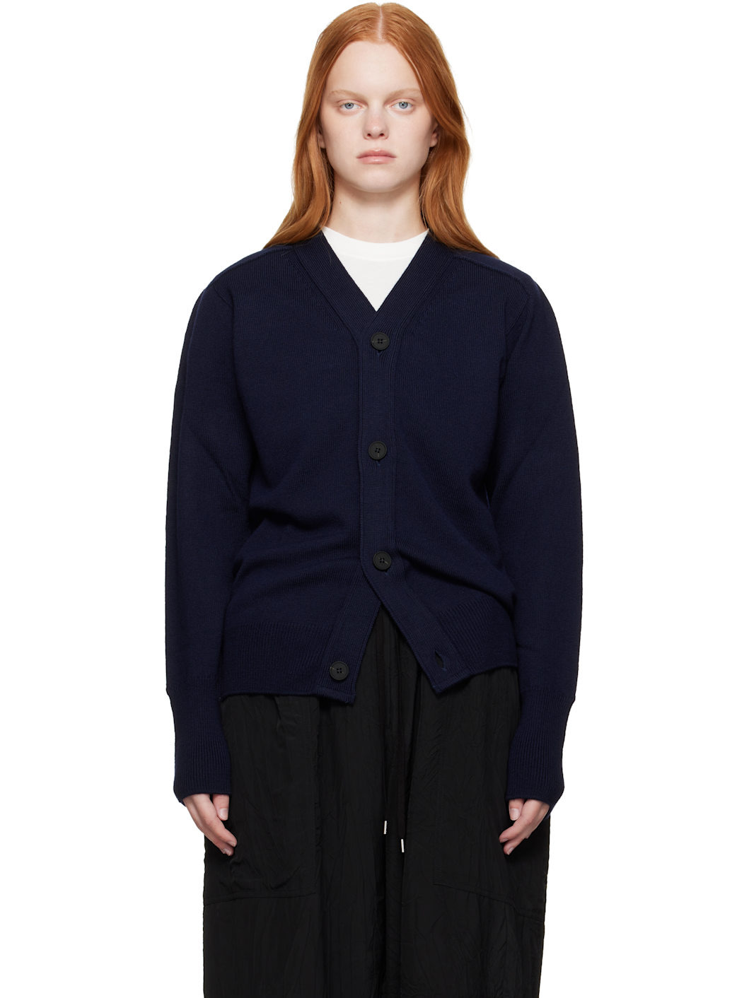 Knit extrafine merino wool cardigan. · Rib-knit Y-neck, hem, and cuffs · Button closure · Saddle shoulders Supplier color: Navy 100% extrafine merino wool. Made in United Kingdom 252608F095000
