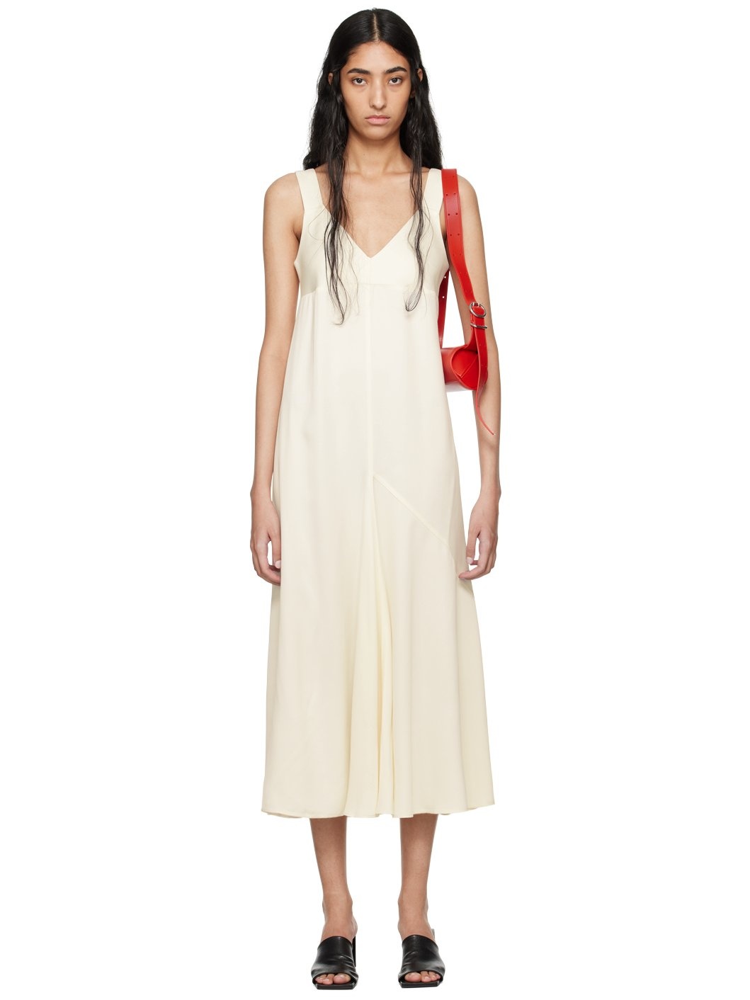 Viscose- and virgin wool-blend crepe de chine dress. · V-neck · Godet panel at front Supplier color: Parchment 83% viscose, 17% virgin wool. Made in Portugal 242608F055008