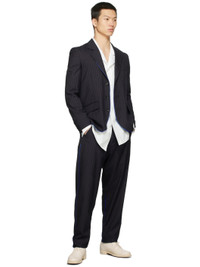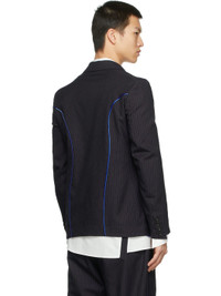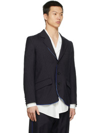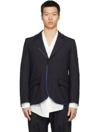 Long sleeve wool-blend twill blazer striped in black and blue. Cupro satin piping in blue throughout. · Notched lapel collar · Three-button closure · Welt pocket at chest · Flap pockets and darts at waist · Four-button surgeon's cuffs · Welt pockets at interior · Full cupro satin lining in black Supplier color: Black Body: 94% wool, 6% polyester. Lining: 100% cupro. Made in Japan 221037M191008