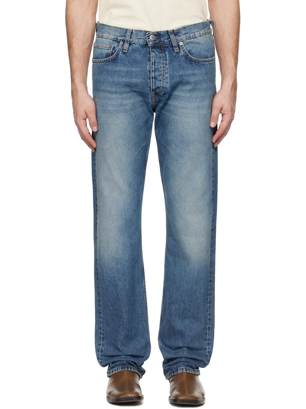 Loose-fit non-stretch organic cotton denim jeans. Hand-fading, whiskering, and distressing throughout. · Belt loops · Five-pocket styling · Button fly · Leather logo patch at back waistband · Logo-engraved silver-tone hardware · Contrast stitching in tan Supplier color: Mid blue 100% organic cotton. Made in Italy 251468M186007