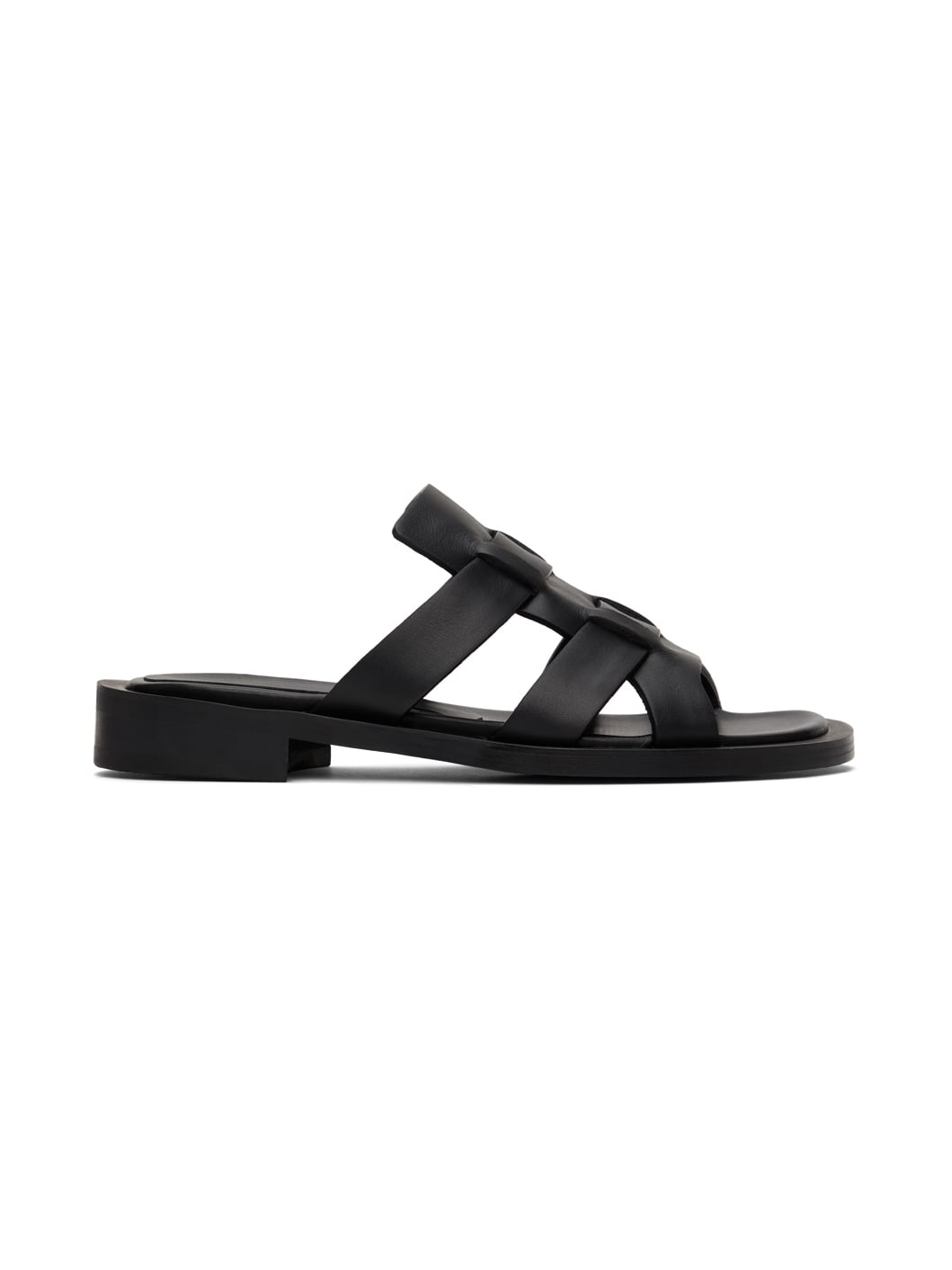 Buffed leather flat sandals in black. · Open round toe · Logo embossed at leather footbed · Stacked leather heel · Rubber outsole Supplier color: Black Upper: leather. Sole: rubber. Made in South Korea 221494F124000