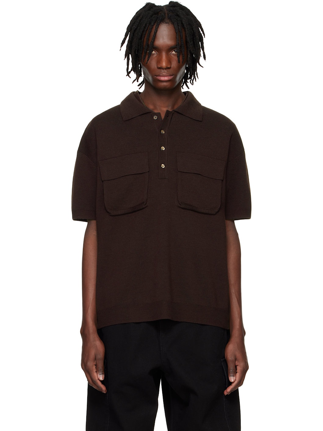Knit wool-blend polo. · Spread collar · Four-button placket · Bellows pockets at chest · Rib-knit hem and cuffs · Dropped shoulders · Logo plaque at back collar Supplier color: Chocolate brown 51% wool, 49% acrylic. Made in South Korea 251494M212009