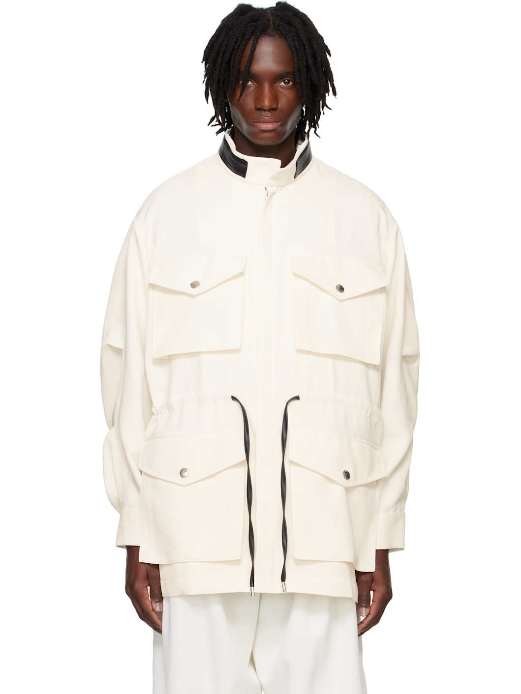 Lightweight polyester cavalry twill jacket. · Faux-leather trim at stand collar · Two-way zip closure · Bellow pockets · Drawstring at waist · Dropped shoulders · Press-stud fastening at cuffs · Hardware at back collar · Logo-engraved silver-tone hardware Supplier color: Ivory Body: 100% polyester. Trim: 100% polyurethane. Made in South Korea 251494M180014