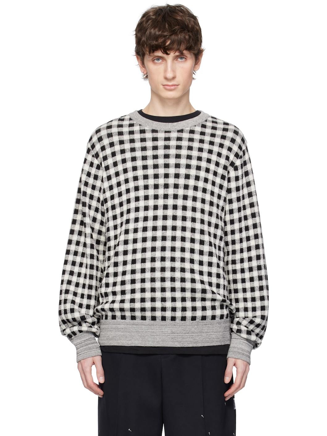 Knit wool- and cotton-blend sweater. · Jacquard check pattern throughout. · Rib-knit crewneck, hem, and cuffs Supplier color: Black/White 50% wool, 50% cotton. Made in Japan 251970M201002