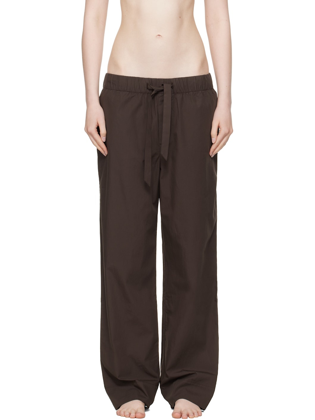 Lightweight organic cotton poplin pyjama pants. · Certified OEKO-TEX® Standard 100 · Straight-leg and loose-fit · Stonewashed · Drawstring at elasticized waistband · Three-pocket styling · Button fly · Logo patch at back pocket · French seams at interior · Mother-of-pearl hardware Supplier color: Coffee 100% cotton. Made in Portugal 252482F079025