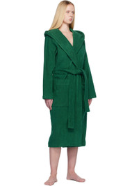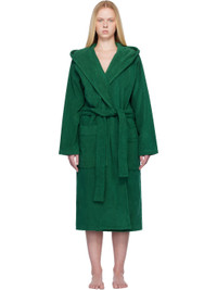 Heavyweight 385 gsm organic cotton terrycloth bathrobe. · Certified GOTS and OEKO-TEX® Standard 100 · Hood at shawl lapel · Open front · Belt loops and detachable self-tie belt · Patch pockets · Logo flag at side seam · Locker loop at inner collar Supplier color: Teal green 100% cotton. Made in Portugal 252482F077009