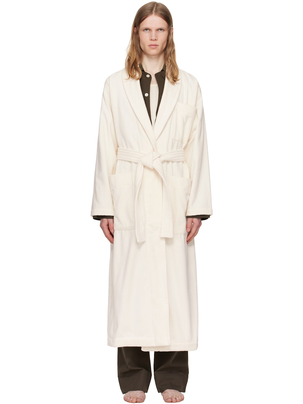 Heavyweight 385 gsm organic cotton terrycloth bathrobe. · Certified OEKO-TEX® Standard 100 · Shawl collar · Open front · Belt loops and detachable self-tie belt · Patch pockets · Logo flag at side seam · Locker loop at inner collar Supplier color: Ivory 100% organic cotton. Made in Portugal 252482M219000