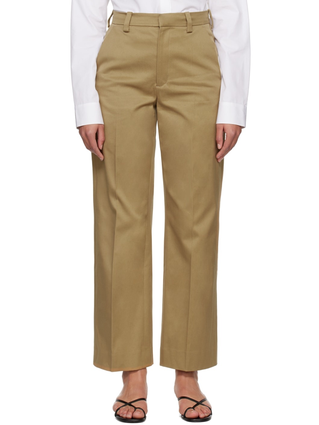 Straight-leg stretch cotton twill trousers. · Belt loops · Four-pocket styling · Zip-fly · Central creases at front and back Wholesale exclusivity at SSENSE. Supplier color: Beige 98% cotton, 2% elastane. Made in Lithuania 222776F087015