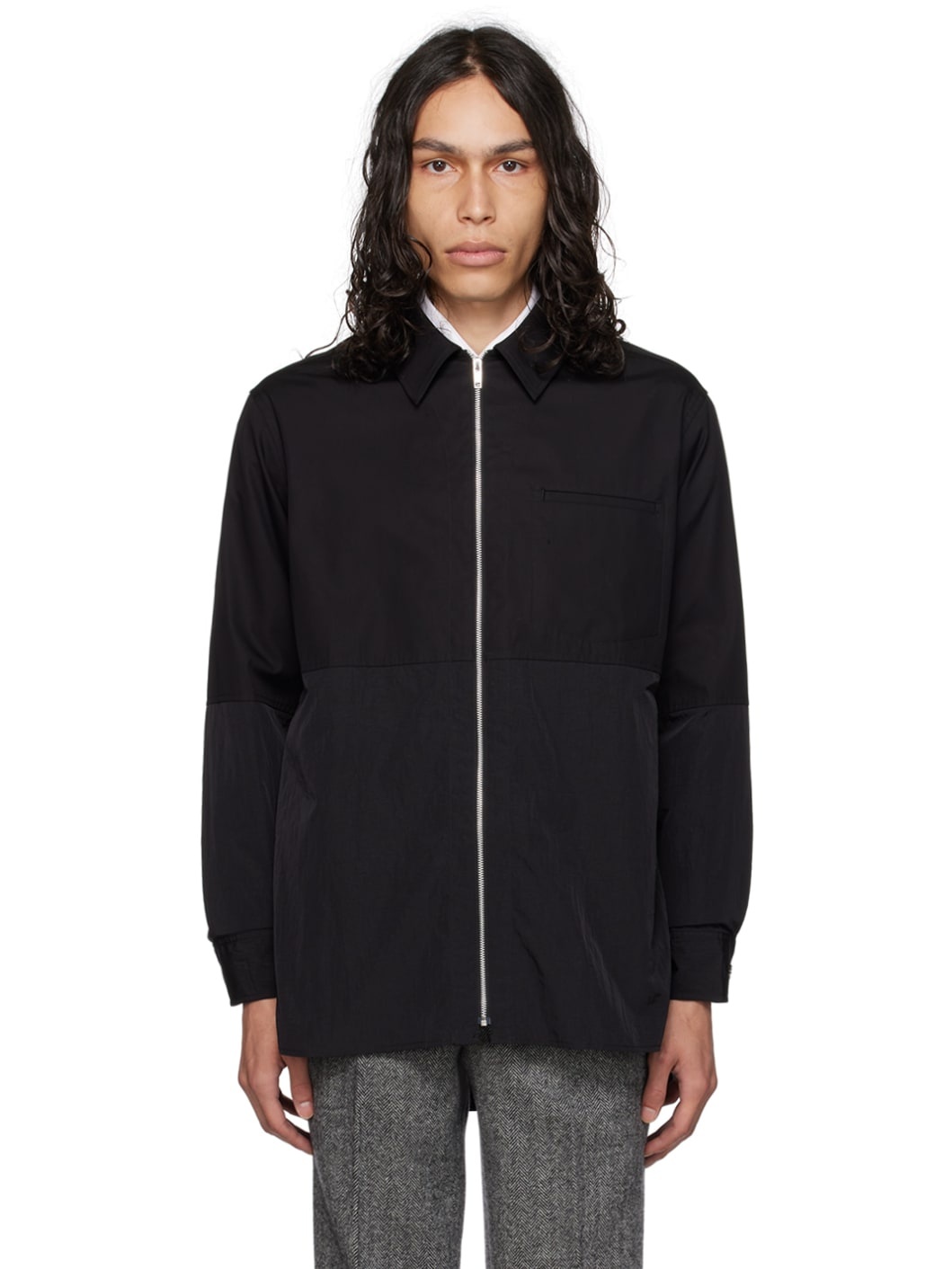 Paneled cotton canvas and crinkled nylon taffeta jacket. · Spread collar · Zip closure · Flap pocket at chest · Gussets at shirttail hem · Seam pockets · Single-button barrel cuffs Supplier color: Black Body 1: 100% cotton. Body 2: 100% nylon. Made in Japan 232304M180002