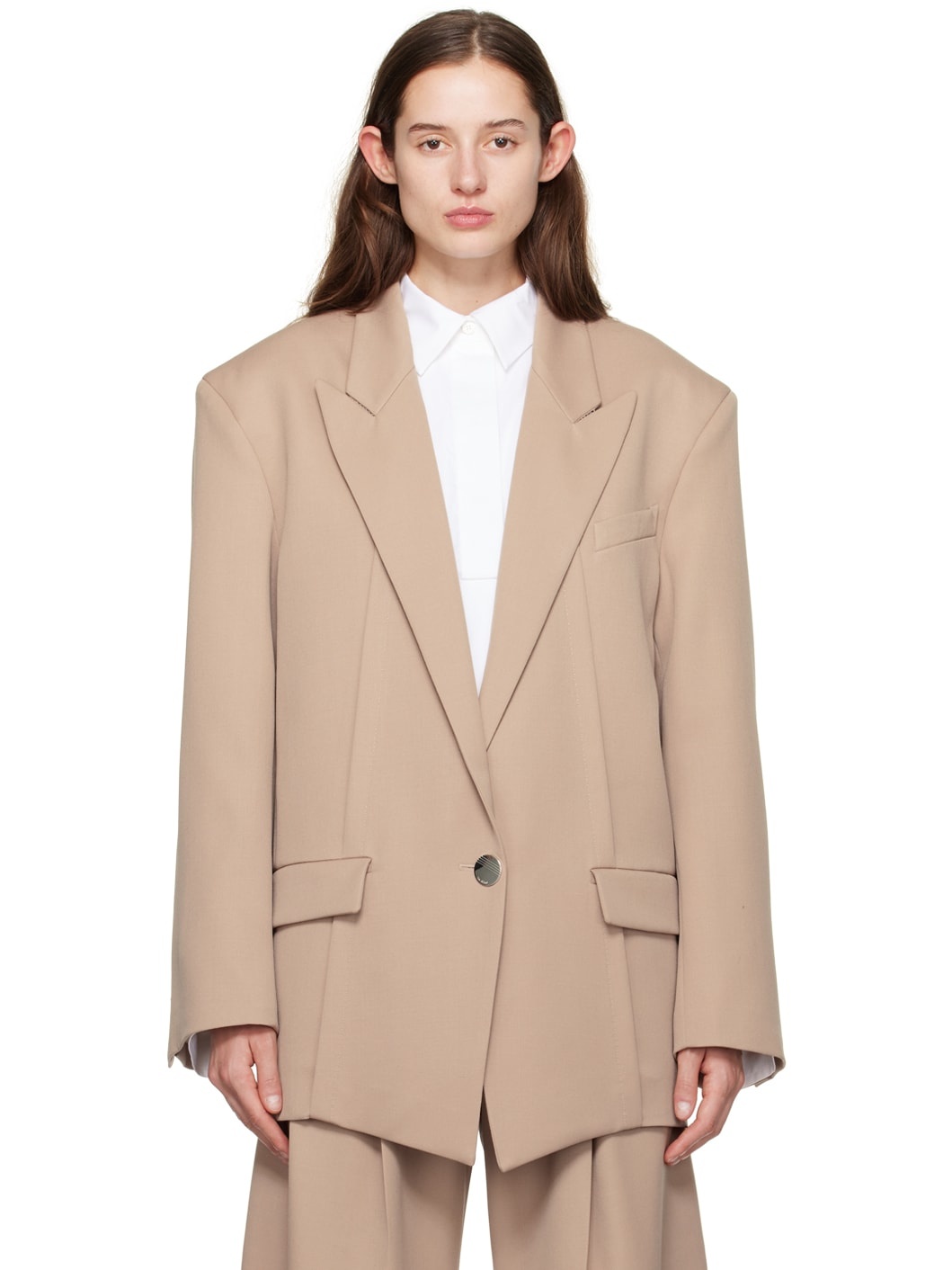 Virgin wool gabardine blazer. · Peaked lapel · Single-button closure · Welt pocket and flap pockets · Pintucks at front · Curved hem · Padded shoulders · Four-button surgeon's cuffs · Full satin lining · Logo-engraved silver-tone hardware Supplier color: Beige Body: 100% virgin wool. Lining: 53% acetate, 47% viscose. Made in Italy 241528F057001