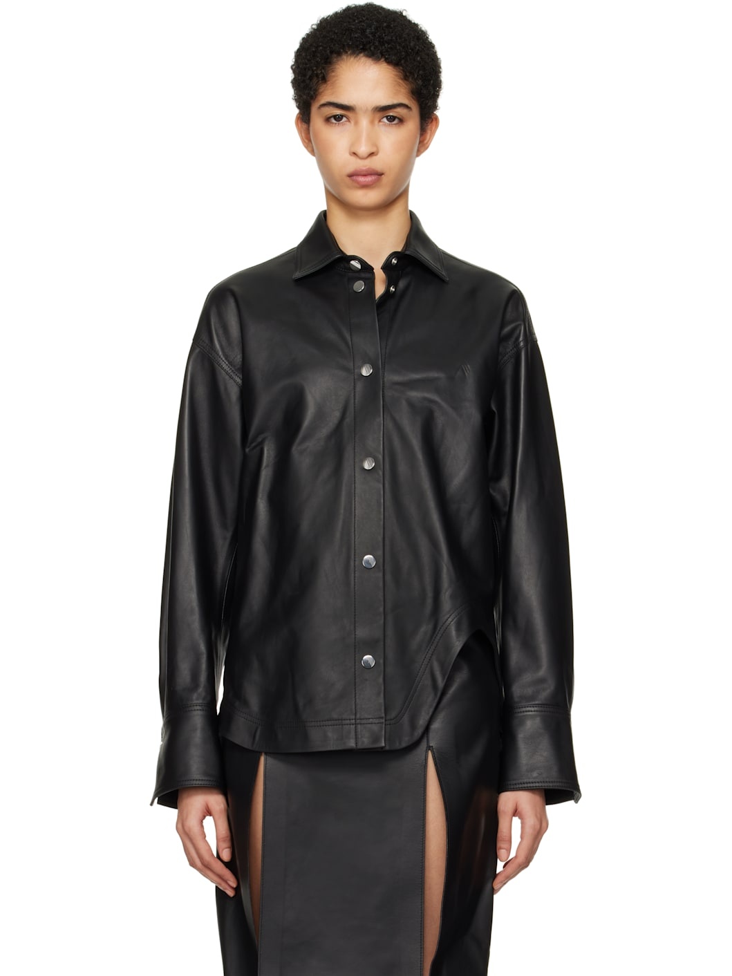 Buffed nappa lambskin shirt. · Spread collar · Press-stud closure · Logo embossed at chest · Asymmetric shirttail hem · Dropped shoulders · Dart at single-press-stud barrel cuffs · Logo-engraved silver-tone hardware Supplier color: Black 100% lambskin. Made in Romania 251528F064000