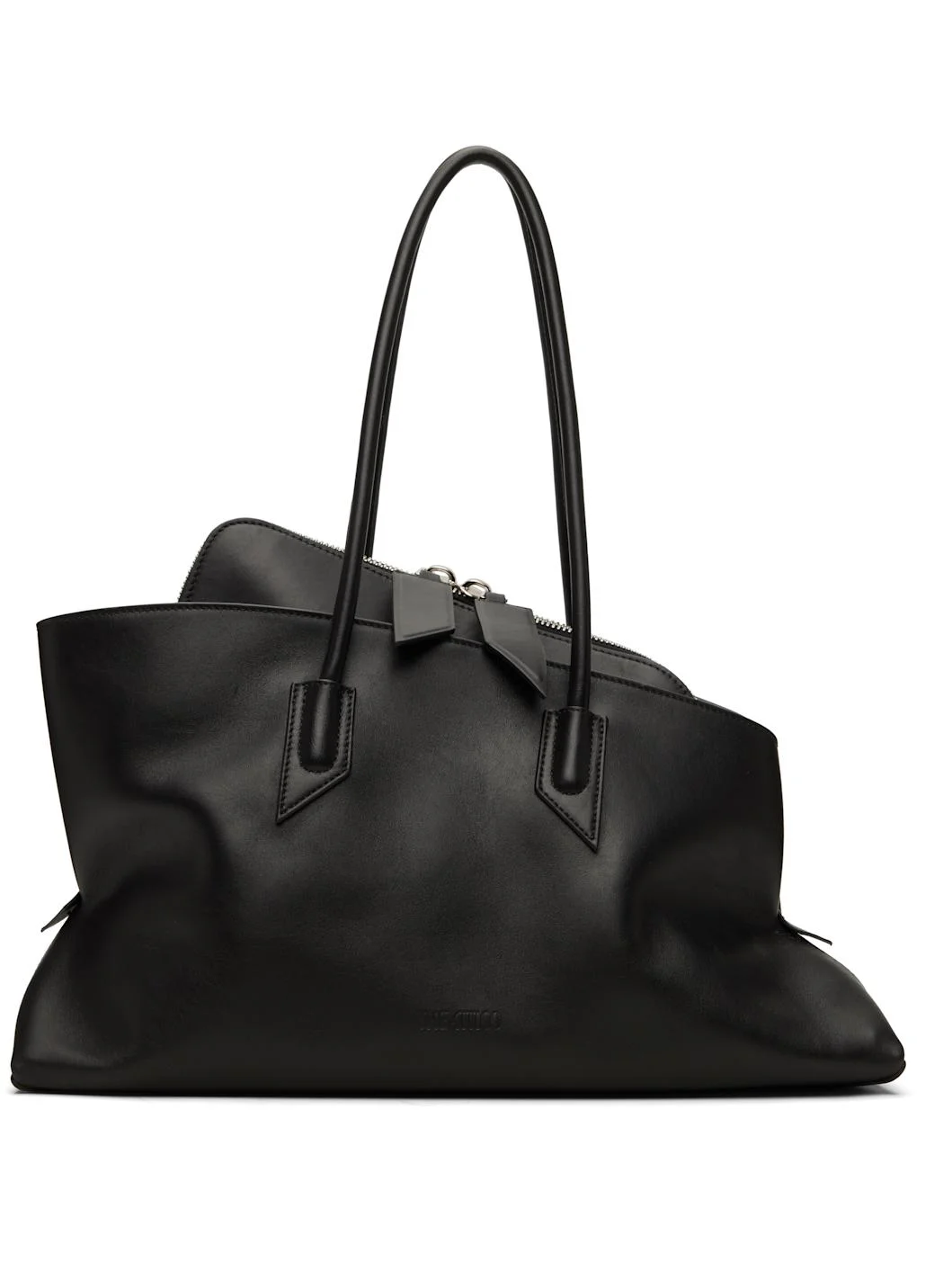 Buffed calfskin top handle bag. · Asymmetrical construction · Fixed shoulder straps · Logo embossed at face · Patch pocket at face and back face · Bumper studs at base · Two-way zip closure · Patch pocket at interior · Suede lining · H6.5" x W16.5" x D6.25" Supplier color: Black 100% calfskin. Made in Italy 261528F048003