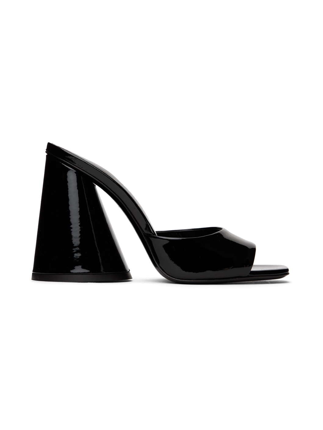 Patent calfskin slip-on heeled sandals in black. · Open square toe · Logo printed at padded leather footbed · Covered cylindrical block heel with rubber injection · Leather sole · Heel: H4 in Supplier color: Black Upper: calfskin. Sole: leather. Made in Italy 232528F125022