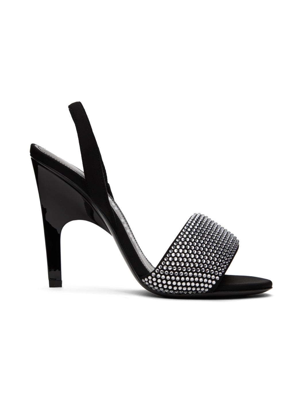 Padded jersey heeled sandals in black. · Open round toe · Crystal-cut detailing at vamp · Elasticized slingback strap · Logo printed at padded leather footbed · Stiletto heel with rubber injection · Leather sole · Heel: H4 in Supplier color: Silver/Black Upper: textile. Sole: leather. Made in Italy 232528F122007