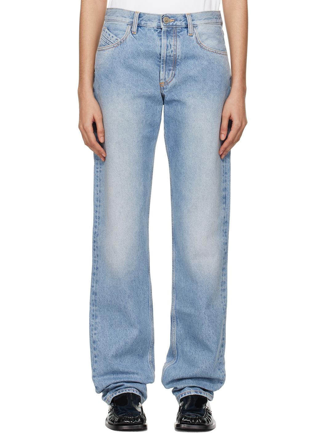 Coated non-stretch denim jeans. Fading throughout. · Belt loops · Five-pocket styling · Button-fly · Logo patch at back waistband · Logo embroidered at back pocket · Logo-engraved antiqued silver-tone hardware · Contrast stitching in tan Supplier color: Sky blue Body: 100% cotton. Lining: 65% polyester, 35% cotton. Made in Italy 251528F069000