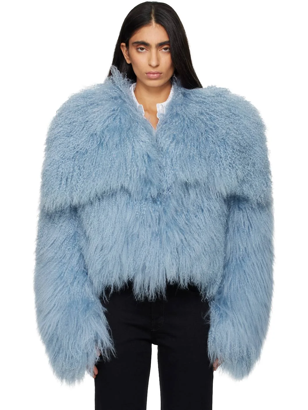 Shearling bomber jacket. · Oversized spread collar · Hook-eye closure · Full logo-woven satin lining Supplier color: Baby blue Body: 100% mongolian lamb fur. Lining: 100% viscose. Made in Italy 261528F062001