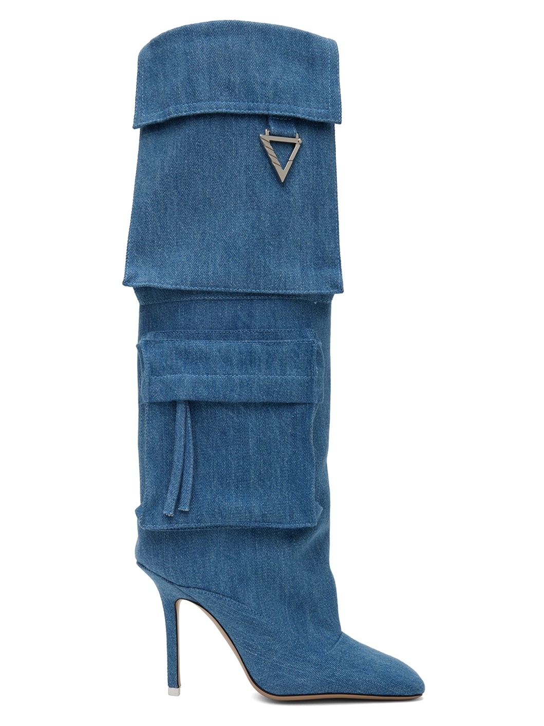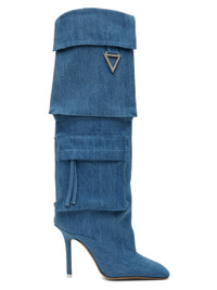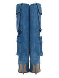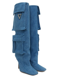 Knee-high denim boots in blue. · Square toe · Bellows pockets at outer side · Grained goatskin lining · Covered stiletto heel with rubber injection · Leather sole · Logo-engraved silver-tone hardware · Heel: H4 in Supplier color: Denim washed Upper: textile. Sole: leather. Made in Italy 232528F114002