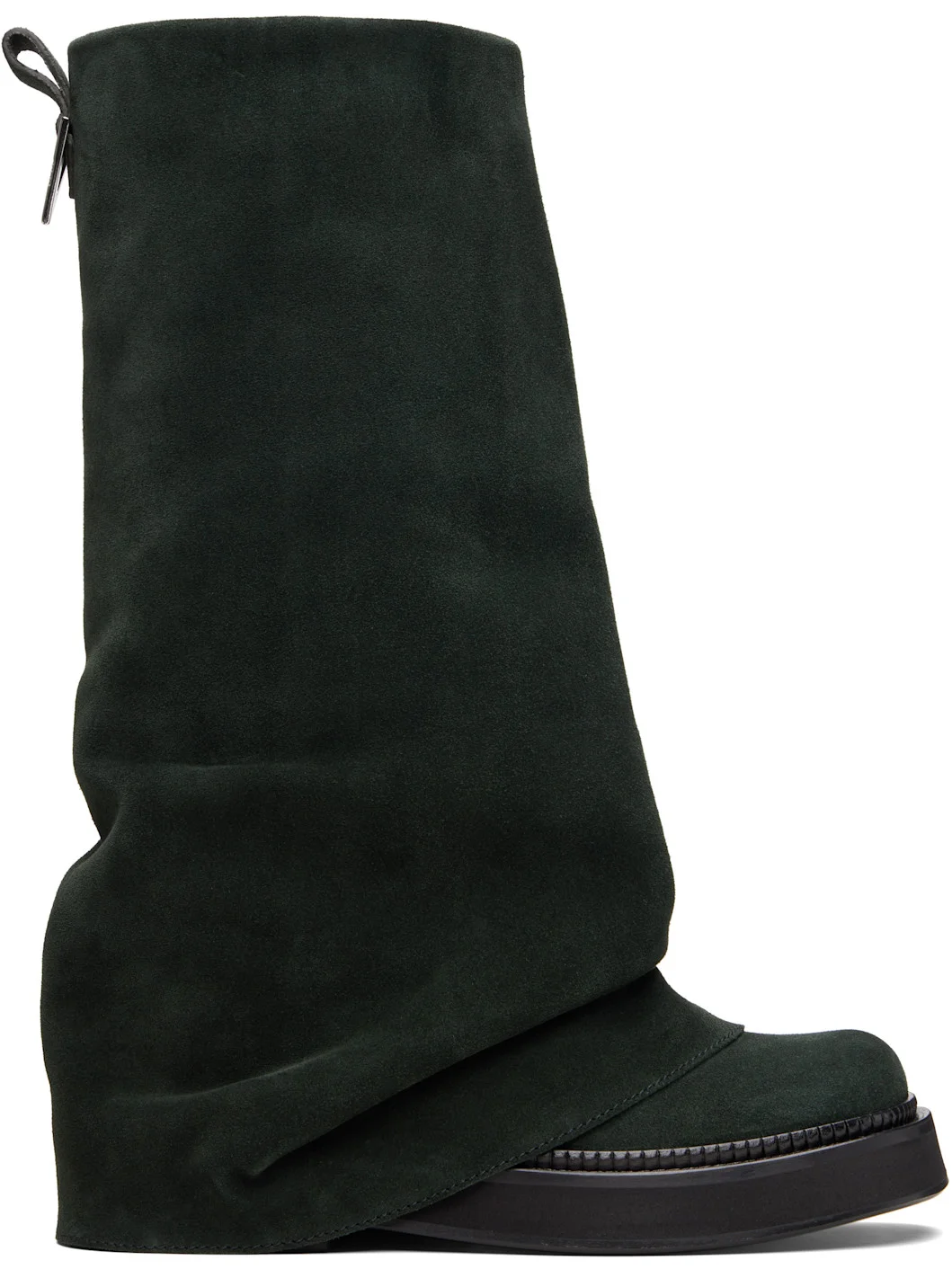 Knee-high suede boots. · Layered construction · Square toe · Pull-loop and logo hardware at heel collar · Buffed leather lining · Serrated edge at welt · Stacked foam rubber midsole and heel · Leather sole Supplier color: Moss Upper: leather. Sole: leather, rubber. Made in Italy 252528F114001