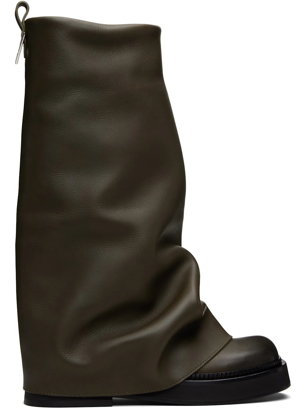 Knee-high grained leather boots. · Layered construction · Square toe · Pull-loop and logo hardware at heel collar · Buffed leather lining · Serrated edge at welt · Stacked foam rubber midsole and heel · Leather sole Supplier color: Green fade Upper: leather. Sole: leather, rubber. Made in Italy 252528F114000