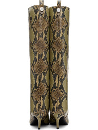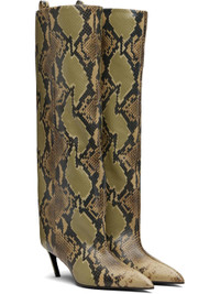 Knee-high snake-embossed calfskin slip-on boots. · Pointed toe · Pull-loop and logo hardware at back collar · Buffed leather lining · Covered kitten heel with rubber injection · Leather sole · Heel: H3" Supplier color: Black/Sahara Upper: calfskin. Sole: leather. Made in Italy 252528F115006