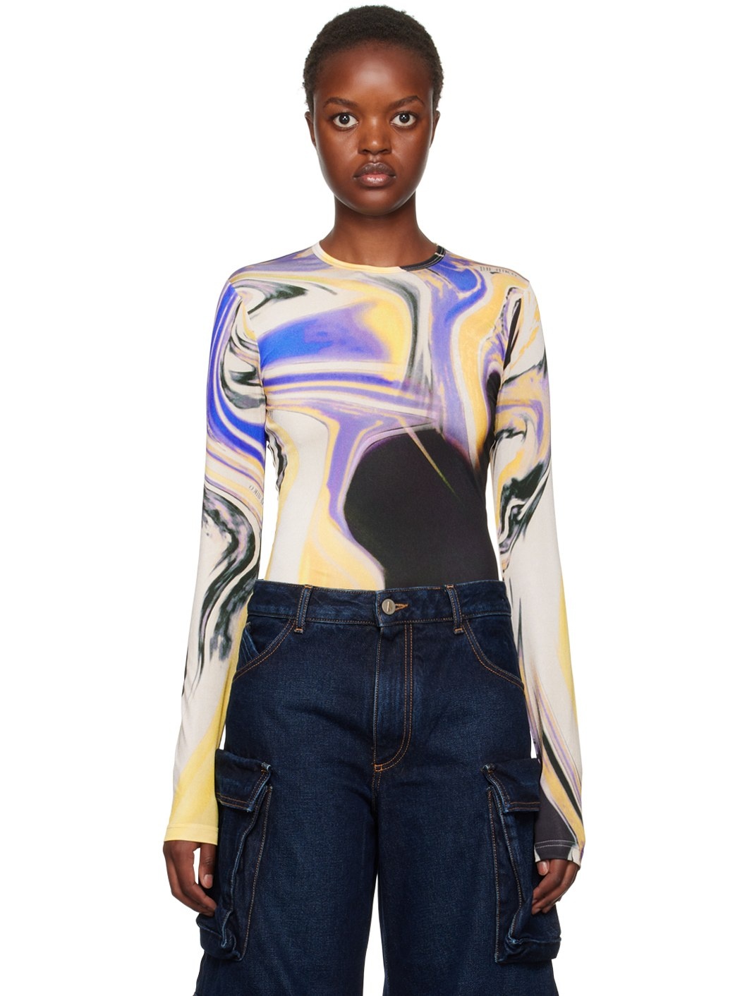 Handcrafted stretch polyester jersey T-shirt. · Logo and graphic pattern printed throughout · Crewneck Supplier color: Lavender/Sunflower 93% polyester, 7% elastane. Made in Italy 232528F110002