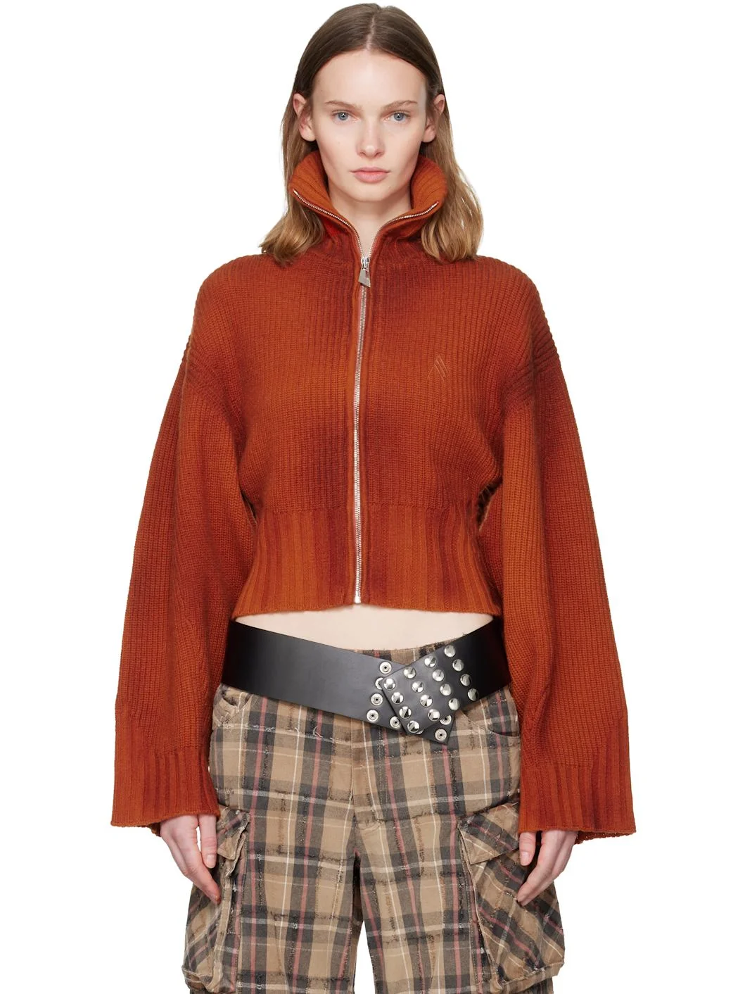 Rib-knit wool- and cashmere-blend cardigan. · Discoloration throughout · Funnel neck · Zip closure · Logo embroidered at chest · Cropped hem · Dropped shoulders Supplier color: Rust 80% wool, 20% cashmere. Made in Italy 252528F095000