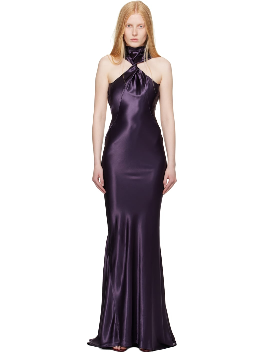 Viscose satin maxi dress. · Mock neck · Twisted detailing at chest and shoulder straps · Button fastening at back collar · Concealed zip closure at low back Supplier color: Purple 100% viscose. Made in Italy 251528F055004