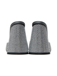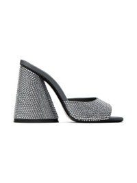 Silk-blend satin heeled sandals in silver-tone. Crystal-cut appliques throughout. · Open square toe · Logo printed at padded goatskin footbed · Covered cylindrical block heel · Leather sole with rubber injection · Heel: H4 in Supplier color: Grey Upper: textile. Sole: rubber, leather. Made in Italy 232528F125010