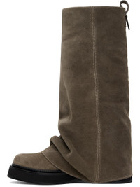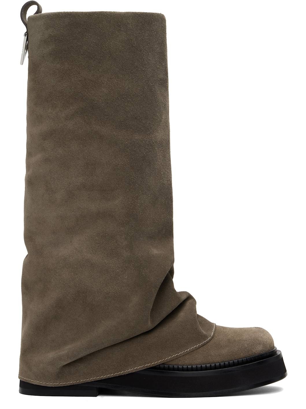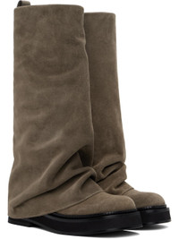 Mid-calf suede boots in taupe. · Layered construction · Square toe · Pull-loop and logo hardware at heel collar · Buffed calfskin lining · Serrated edge at welt · Stacked leather and rubber midsole and heel · Leather sole · Heel: H1.75" Supplier color: Taupe