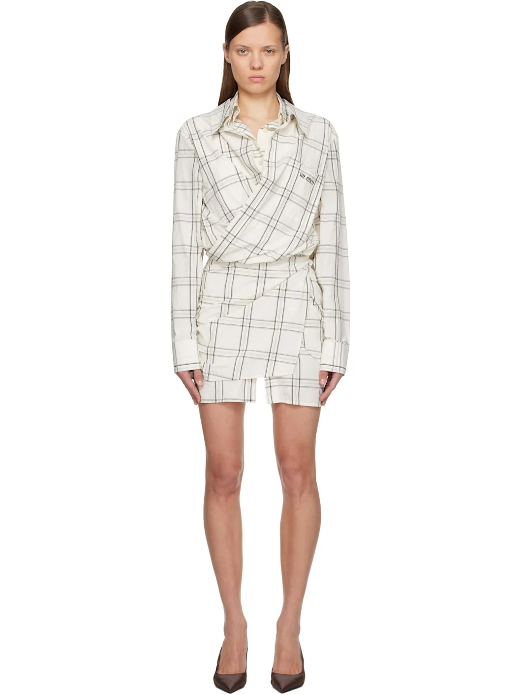 Cotton poplin minidress. · Layered wrap construction · Check pattern and gathering throughout · Spread collars · Button closure · Logo-embroidered patch pocket at chest · Button fastening at waist · Vented hem · Buttoned barrel cuffs Supplier color: White/Black 100% cotton. Made in Italy 261528F052006