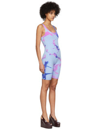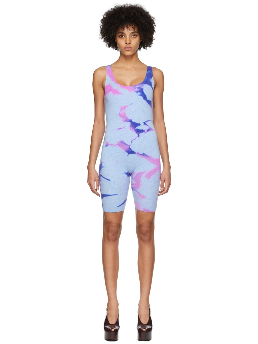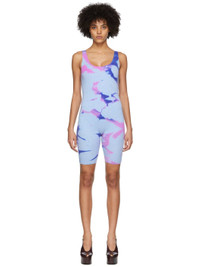 Handcrafted stretch knit cashmere jumpsuit. Tie-dye pattern throughout. · Scoop neck · Elasticized shoulder straps Each item is unique. Please note that coloration may vary. Supplier color: Blue ice/Cyclone 94% cashmere, 6% lycra.