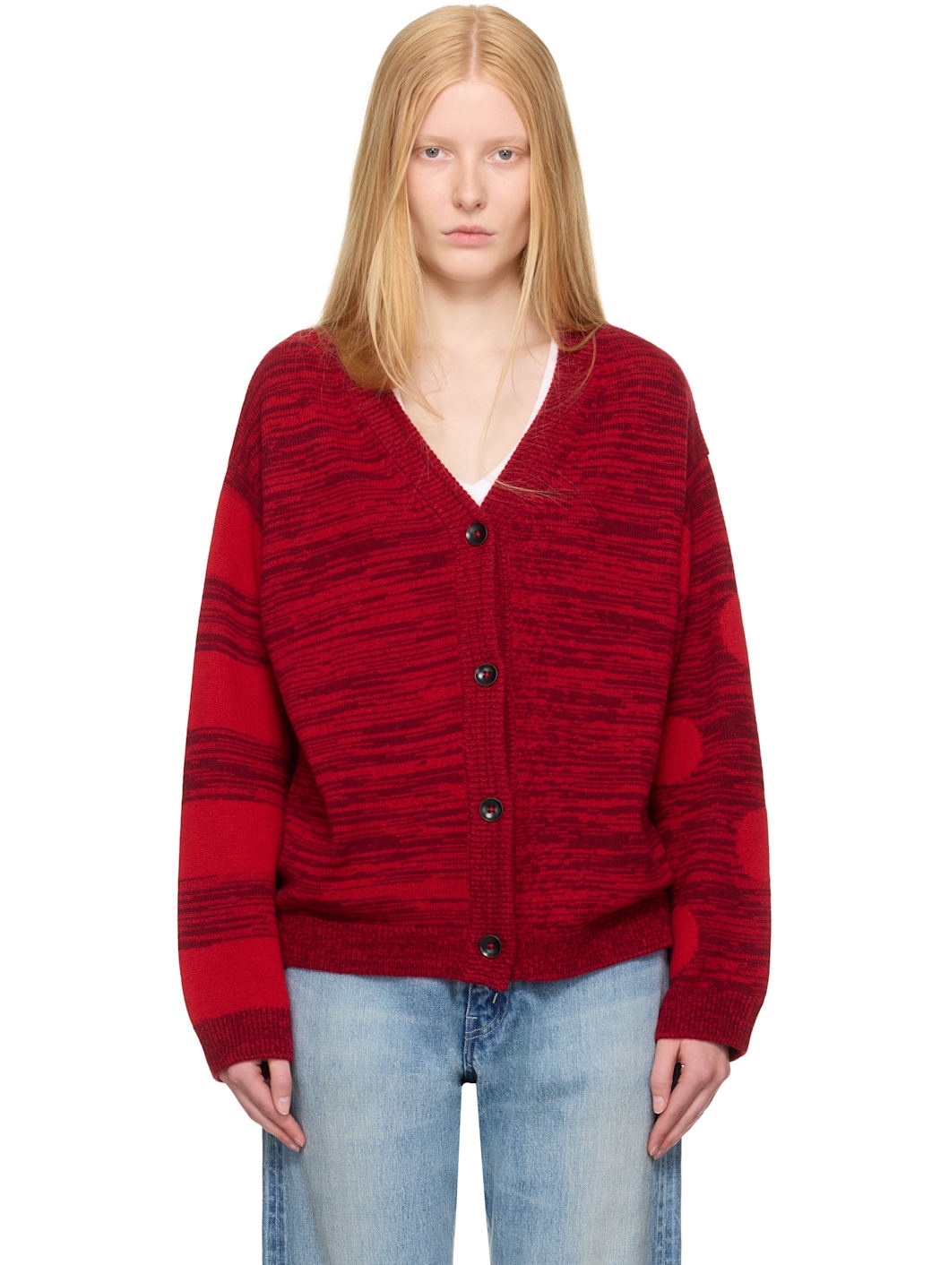 Hand-knit cashmere cardigan. Intarsia stripes and polka-dot pattern throughout. · Rib-knit Y-neck, hem, and cuffs · Button closure · Dropped shoulders · Intarsia graphic and text at back Supplier color: Red cedar/Bubblegum 100% cashmere. Made in United States 252014F095001