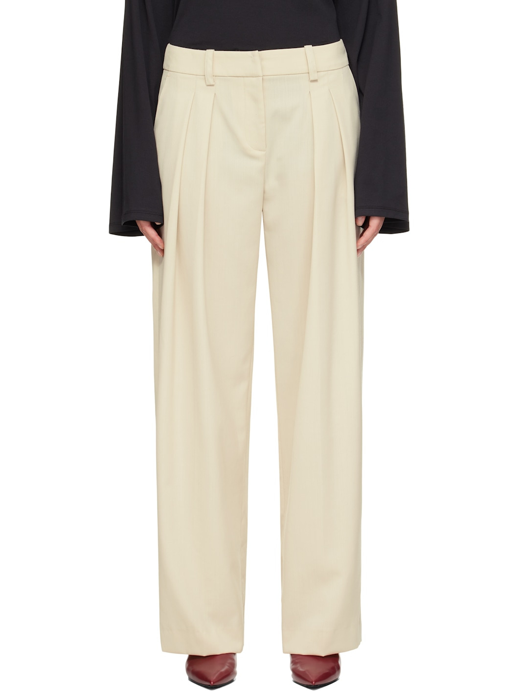Virgin wool-blend twill trousers. · Wide-leg · High-rise · Belt loops · Three-pocket styling · Zip fly · Pleats at front · Creased legs Supplier color: Cement Body: 55% polyester, 45% virgin wool. Trim: 100% polyester. Made in Serbia 252115F087017