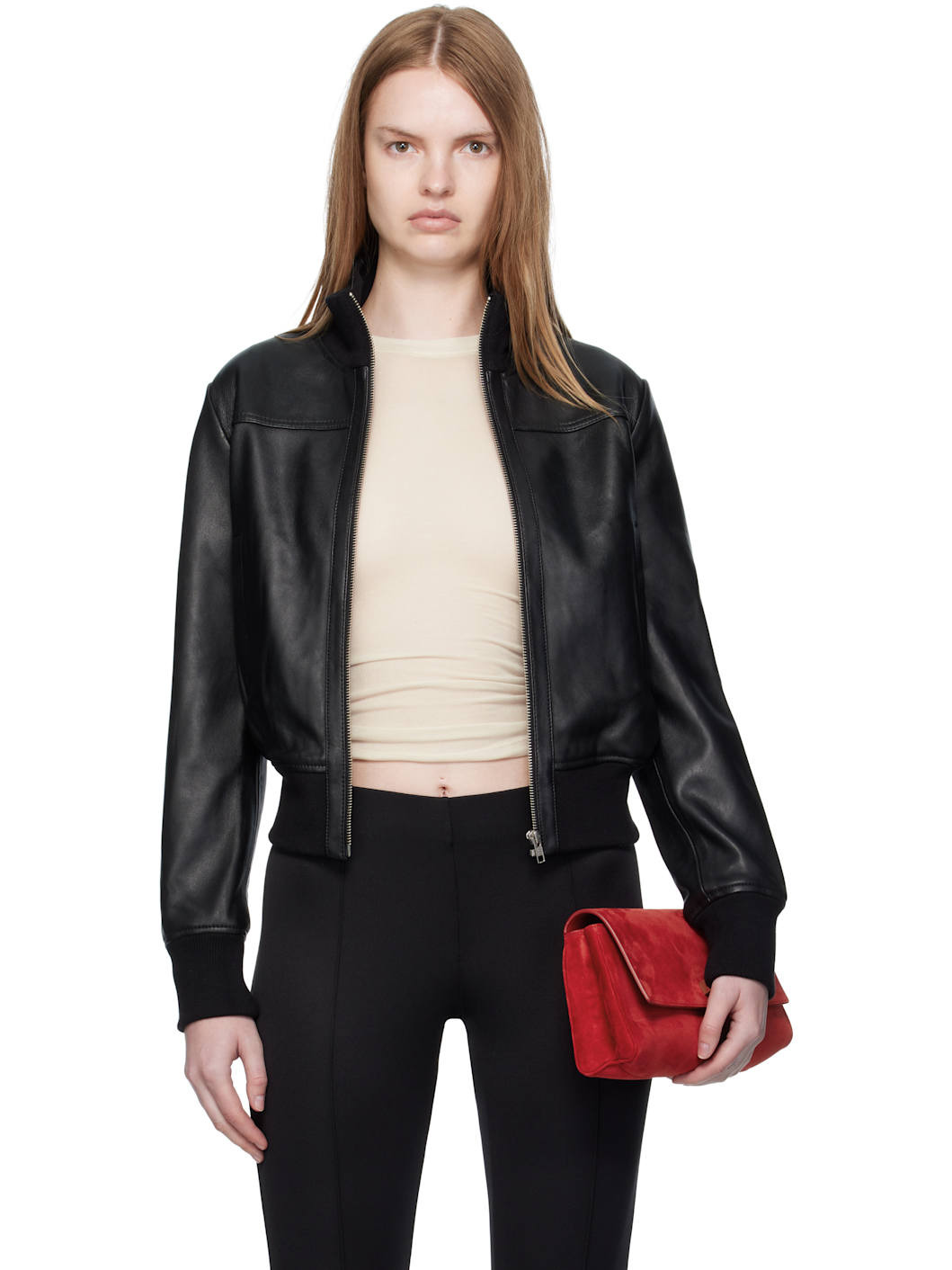 Grained lambskin jacket. · Rib-knit stand collar, hem, and cuffs · Zip closure · Welt pockets at waist · Cropped hem · Full satin lining Supplier color: Black Body: 100% lambskin. Lining: 100% polyester. Made in India 252115F064001